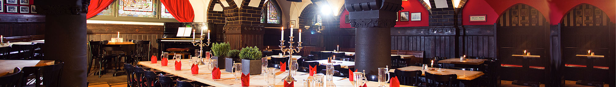 Our Vault With its ornate pillars, vaulted ceilings, stained glass windows and the "Twenty councilor panel": It meets all expectations of a Ratskeller. It has romantic coves arranged around its heart - the bar counter with its copper tubes, from which fresh beers flow. All of the above creates the heart of the "Ratskeller" in which to socialise in ambiance and comfort.
