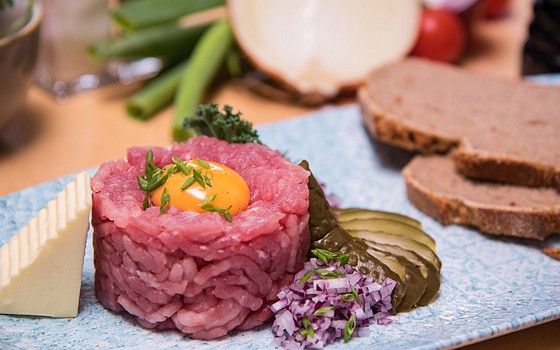 Hackepeter! Frisches Schweinehack, Eigelb, Zwiebeln, Gewürze, Butter, Gewürzgurke und Sauerteigbrot!