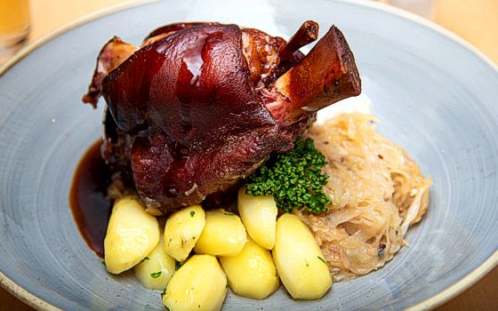 Wir bereiten eine Schweinshaxe, die über Buche und Wacholder frisch geräuchert wird und servieren diese mit Sauerkraut, Kartoffeln und Bier-Jus