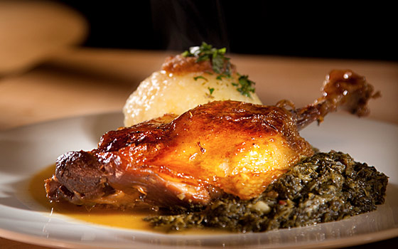Confierte Keule von der Martinsgans glasiert mit Gewürzhonig, dazu Grünkohl oder Preiselbeerrotkraut und Thüringer Kloß